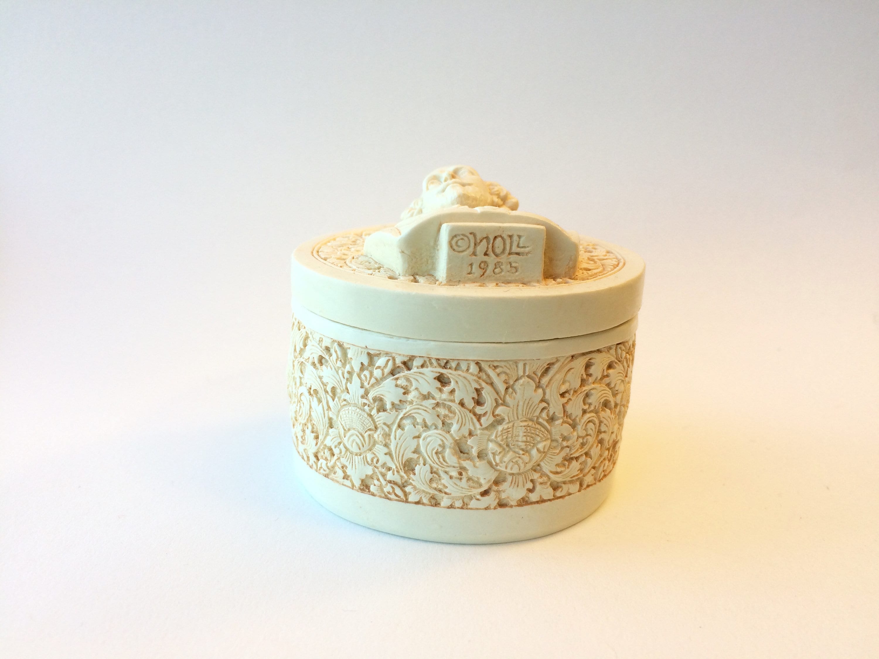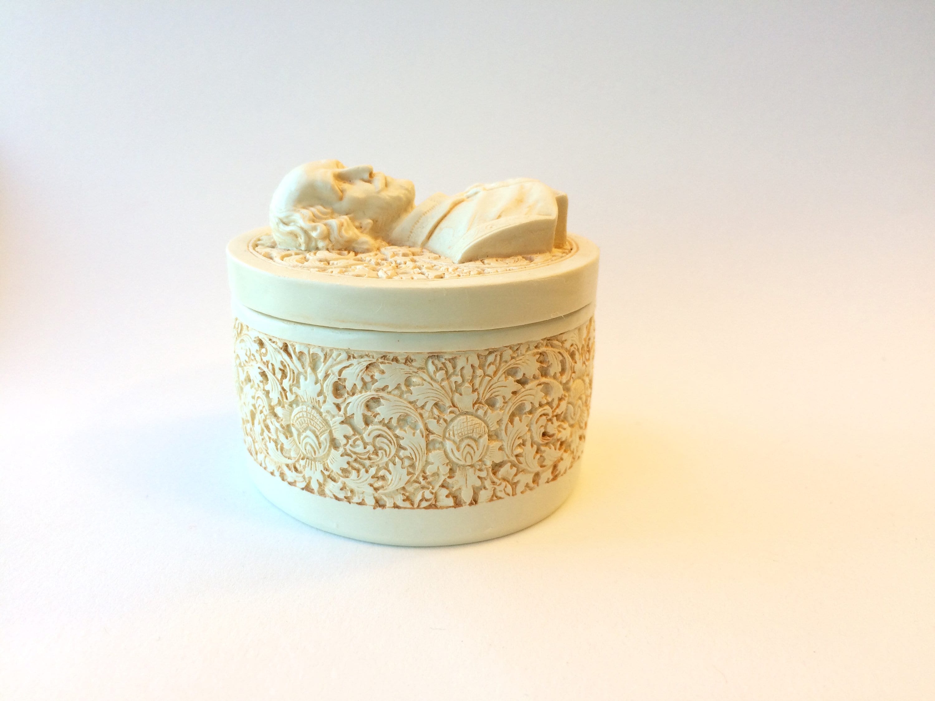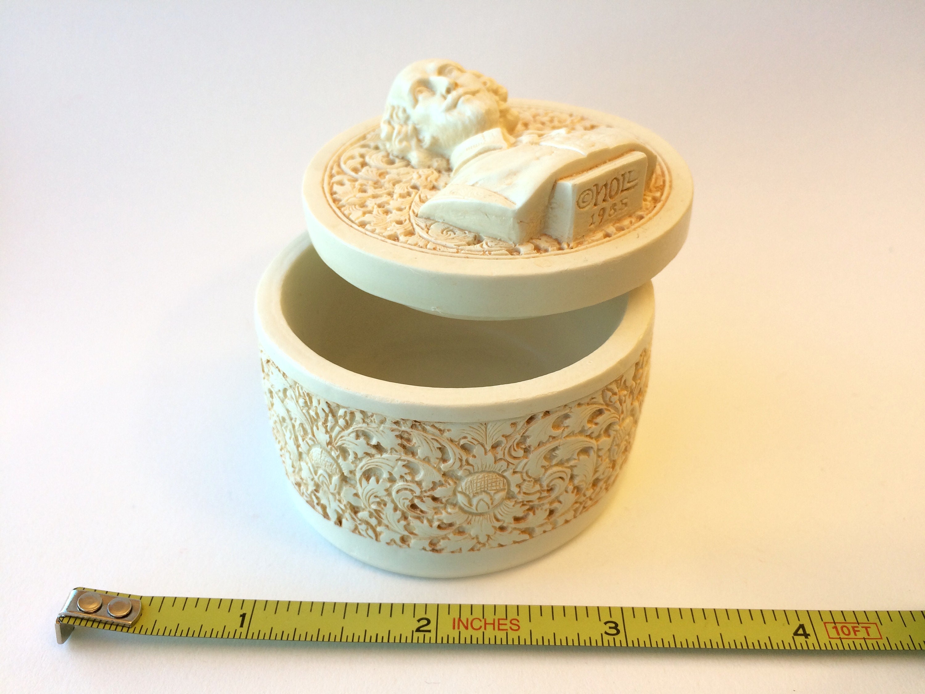 This highly detailed box is handmade from hand cast ivory. I then finish and buff it by hand to achieve a nice feel.